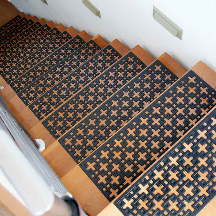 安全:这些垫子可以轻松定义楼梯上每个台阶的尺寸,以便于访问和可见。增加的牵引力还确保任何人使用楼梯时他们的立足点都是稳固的。